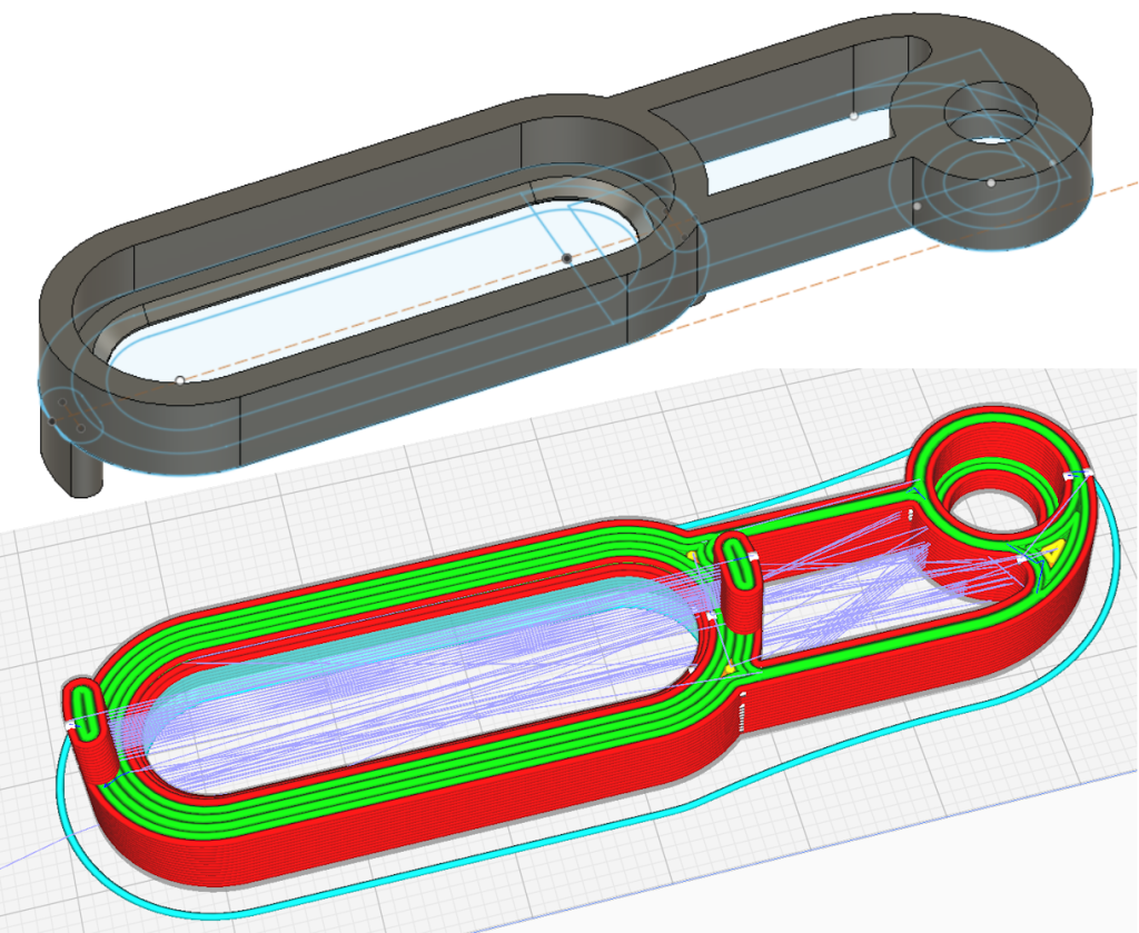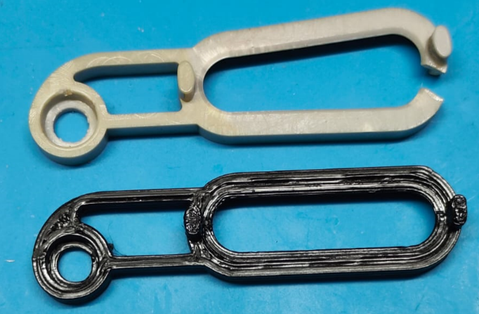 Celem druku technicznego nie zawsze jest wygląd, a właściwości mechaniczne są najważniejsze. Poniżej przykładowy wydruk w technologi EDM (filamnetowej), z dużą dyszą wydruk nie prezentuje się szczególnie pięknie, ale czas drukowania to 10 minut! Materiał PET-G pozwala na nieco bardziej elastyczne elementy w porównaniu do PLA i ma większą wytrzymałość na temperaturę – nawet do 80C.
