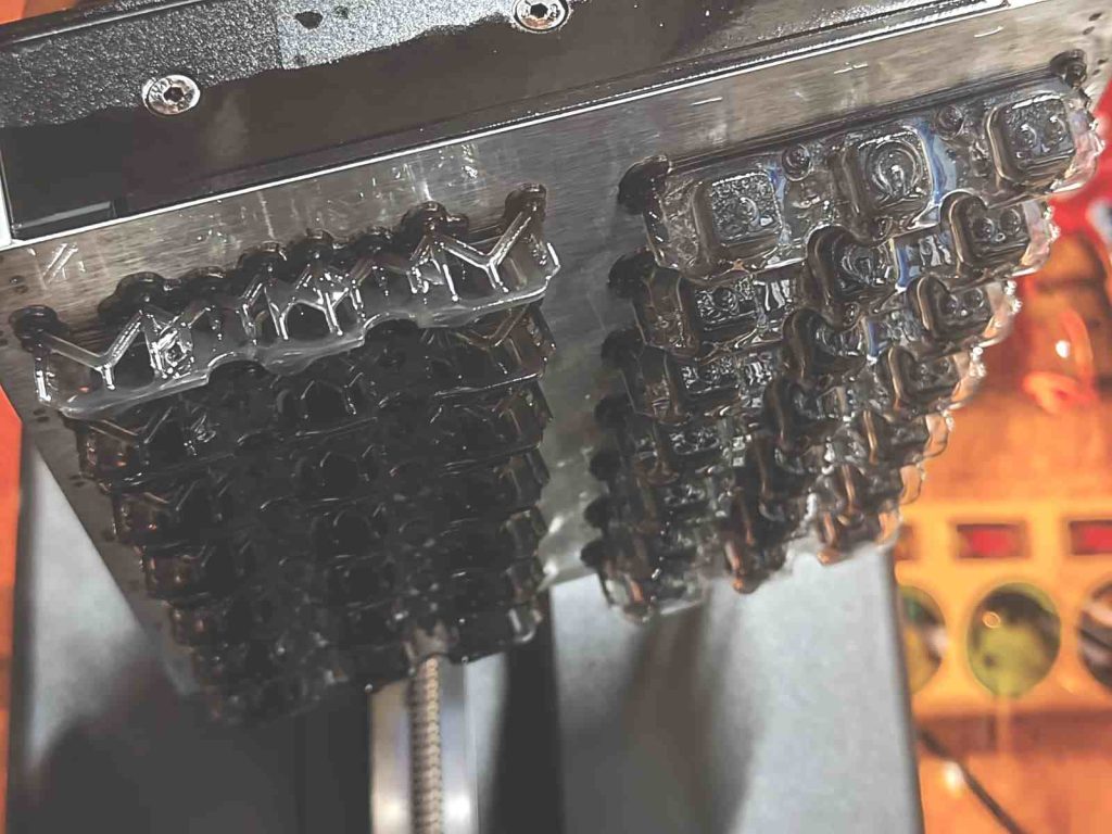 Tutaj przykład żywicy Flexible 80A czernionej, efekt końcowy jest bardzo zadowalający, rozdzielczość 50 mikrometrów i specjalnie dobrany profil druku kompensujący rozciąganie się żywicy podczas wydruku. Produkcja małoseryjna: drukowane po 14 sztuk na raz zapewniają wydajność i jakość wykończenia.